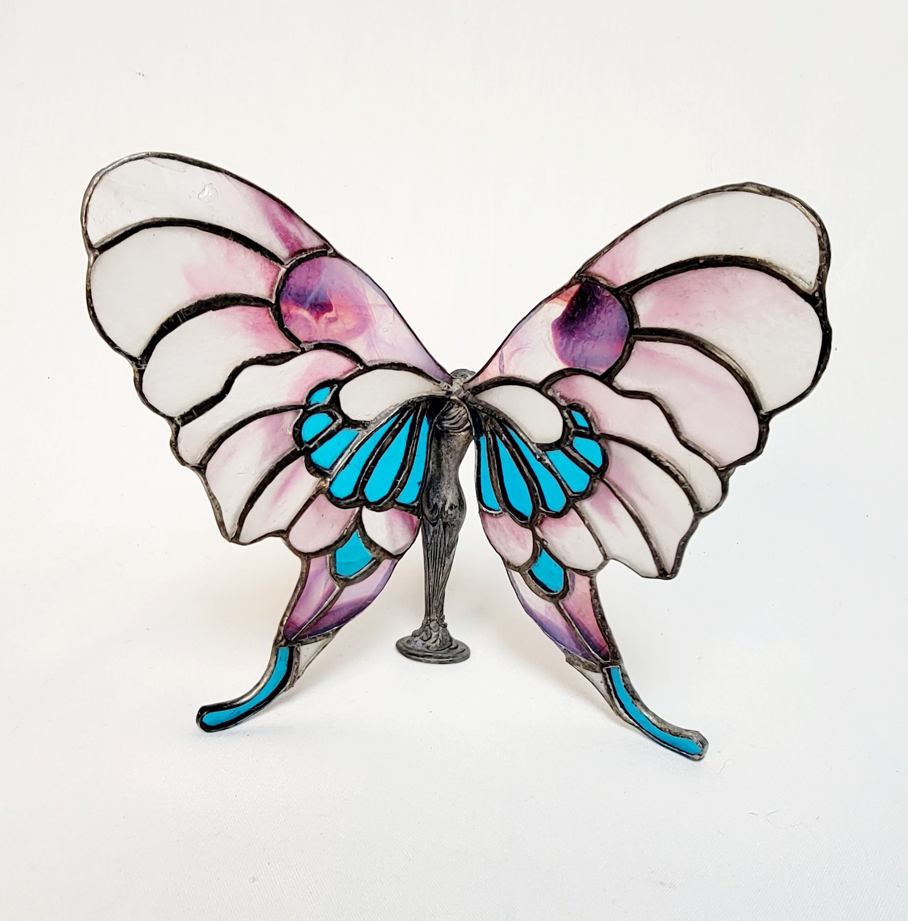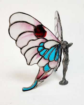 This Butterfly Lady #1 Stained Glass Figurine is a beautiful piece of art, designed and created by the renowned artist Michael Ziegler. Each figurine is handmade and unique, with fine details that bring this whimsical lady to life. Perfect for a collector or as a gift, bring a touch of beauty into your home with this exquisite stained glass figure.