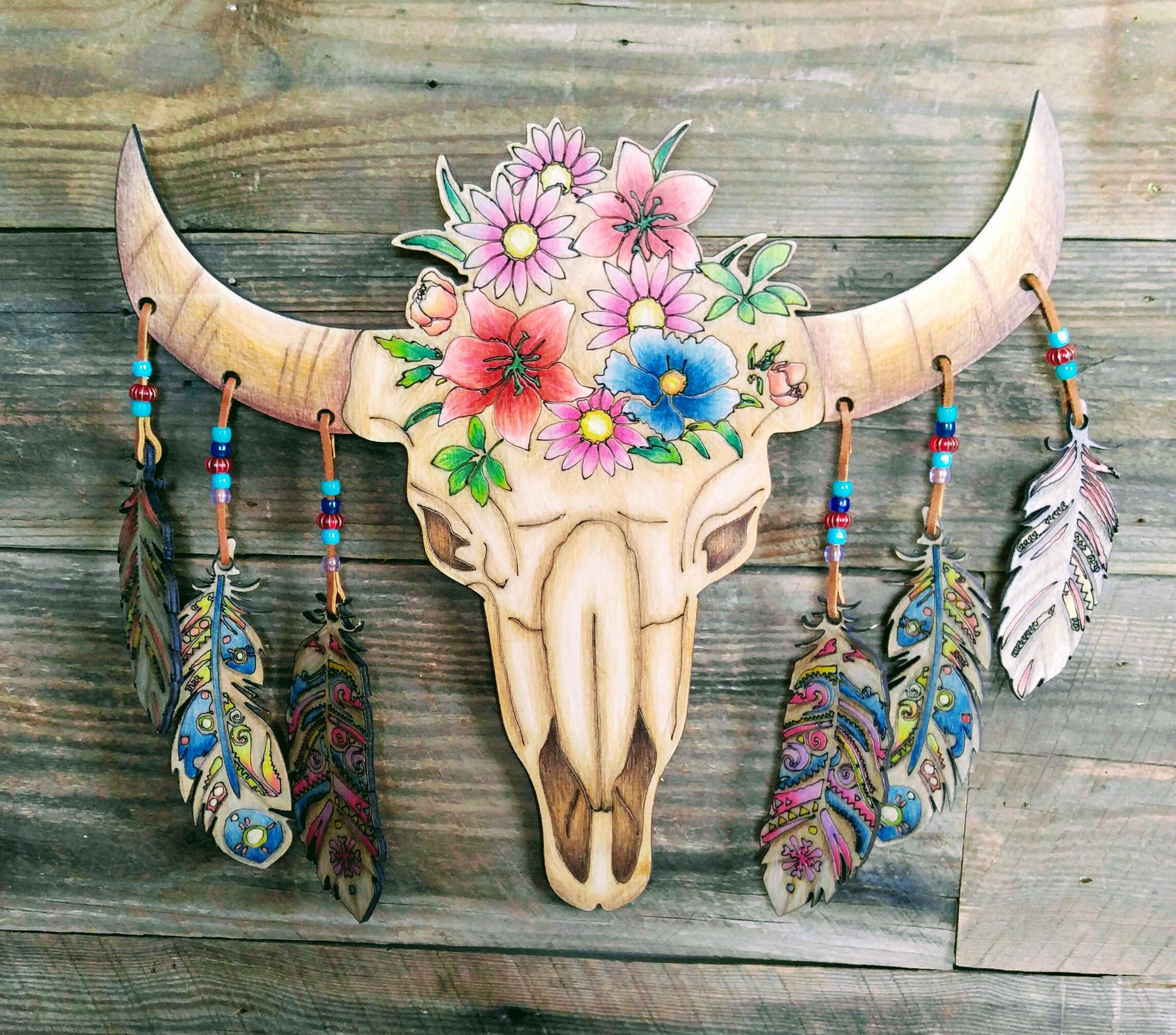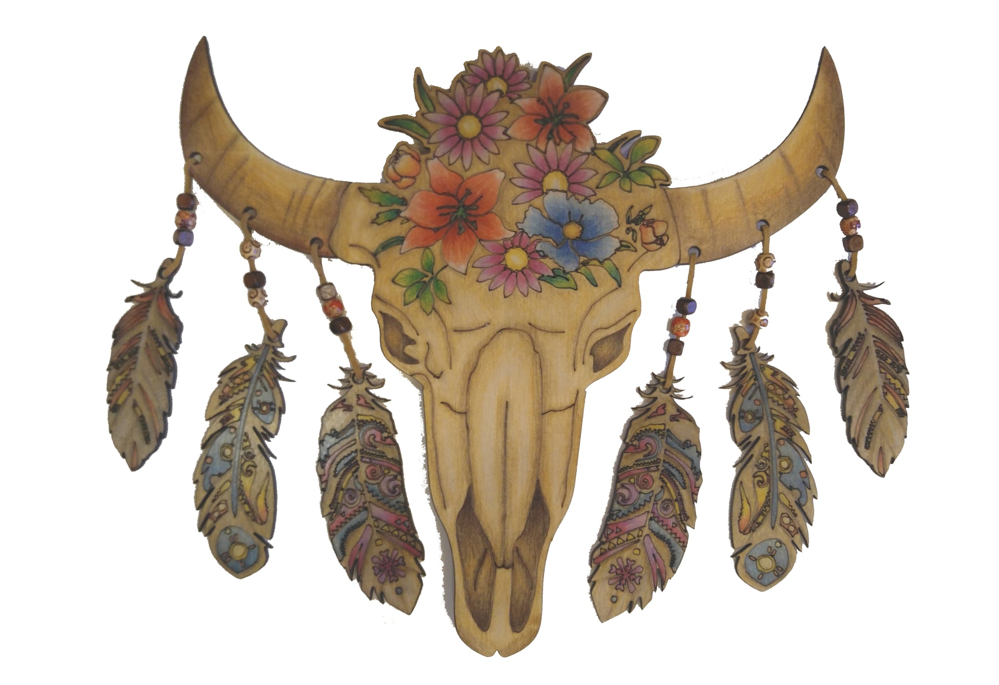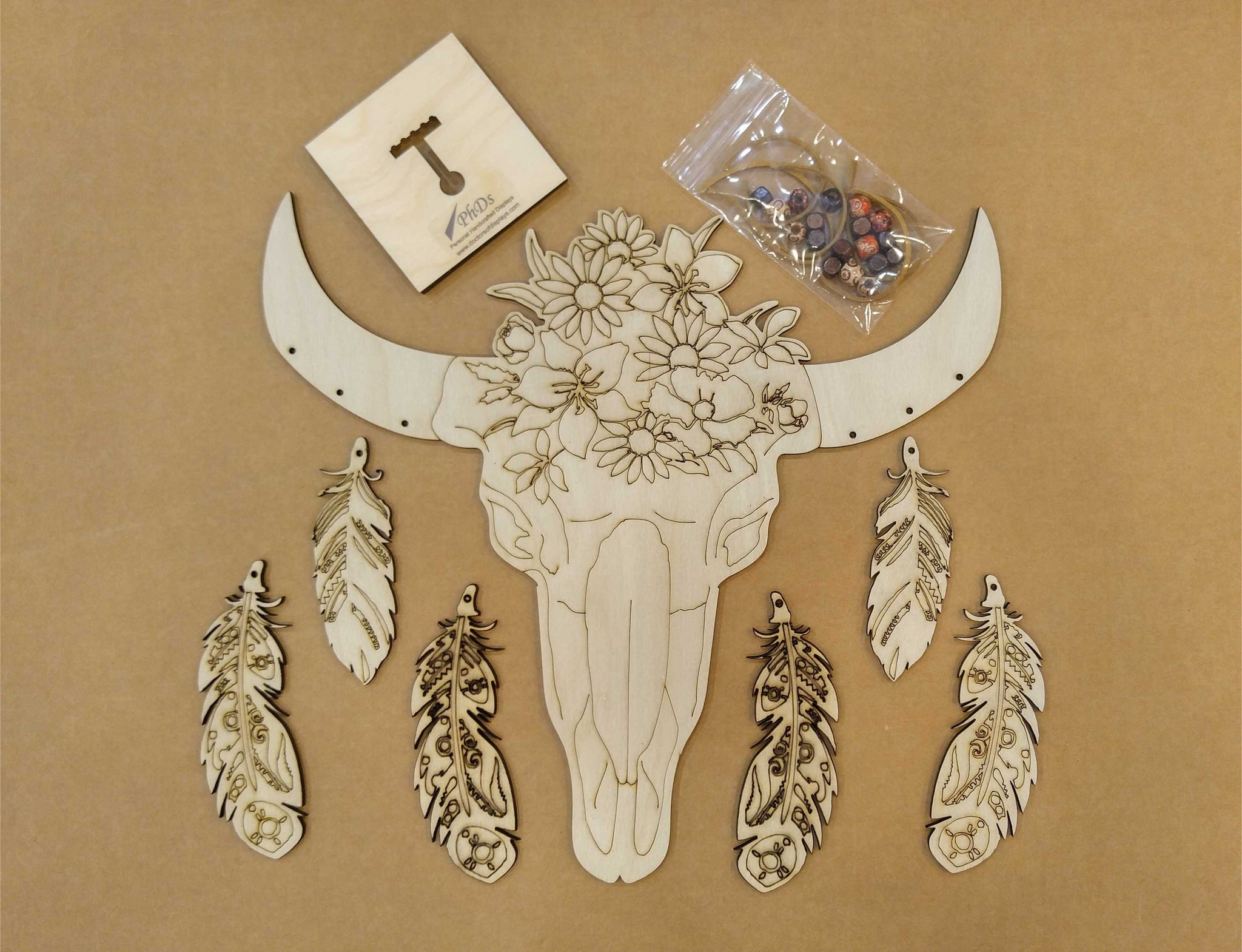 This wood bull skull kit includes a wood cutout (average 12" wide) and six feathers with coloring guidelines lightly engraved into the wood to help you along the way. Also included are 18 colorful beads and leather cords for attaching beads and feathers to the horns. (Some assembly required). You will also receive a wood keyhole hanger and spacer that can be easily attached with double-sided tape, provided. These give the piece a "floating" stand-out effect when hung on the wall.