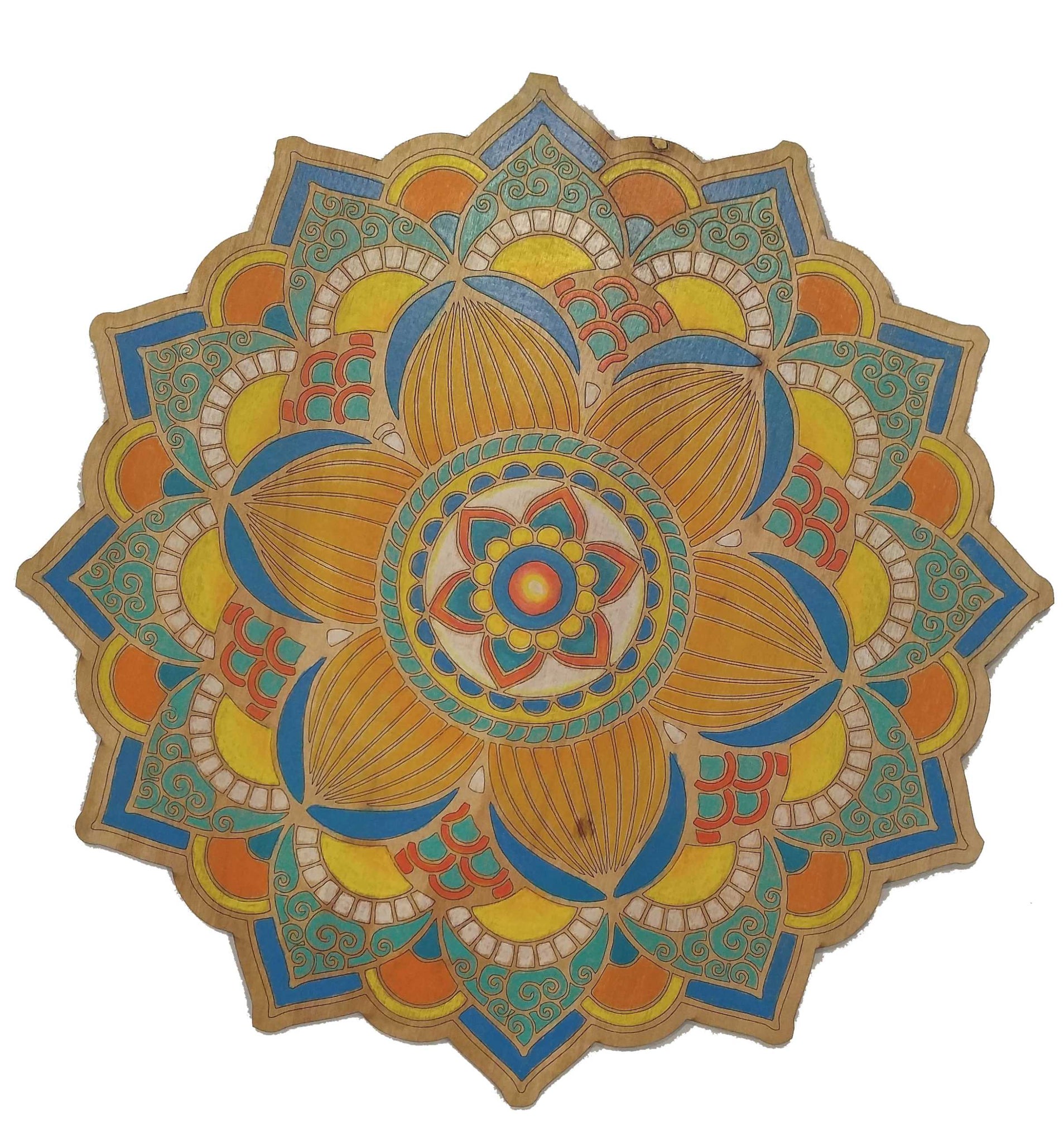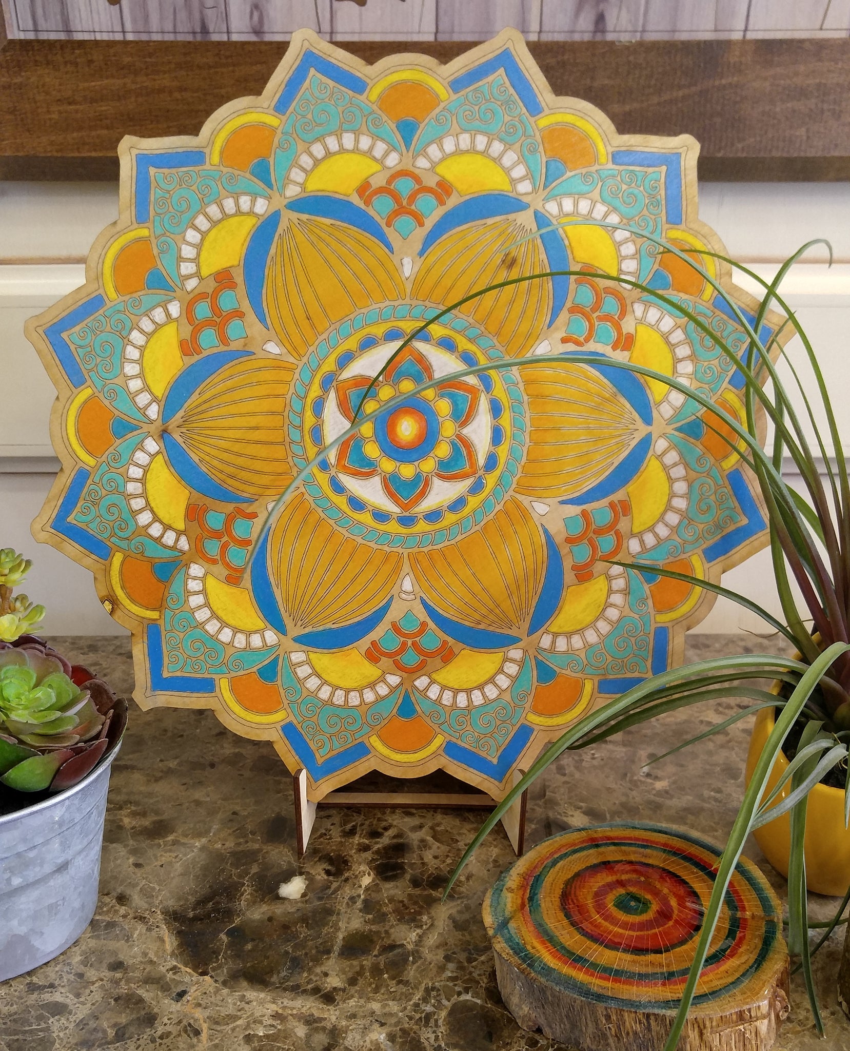 This wood mandala kit includes a wood cutout (approximately 12" wide) with coloring guidelines lightly engraved into the wood to help you along the way. You can choose either a wood keyhole hanger and spacer that can be easily attached with double-sided tape, provided. These give the piece a "floating" stand-out effect when hung on the wall or choose a wooden easel to display your artwork on a shelf or table.