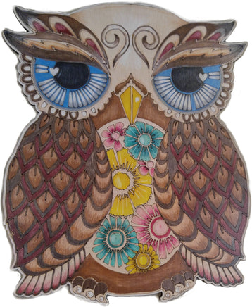 This wood owl kit includes a wood cutout (approximately 12" wide) with coloring guidelines lightly engraved into the wood to help you along the way. You will also receive a wood keyhole hanger and spacer that can be easily attached with double-sided tape, provided. These give the piece a "floating" stand-out effect when hung on the wall.