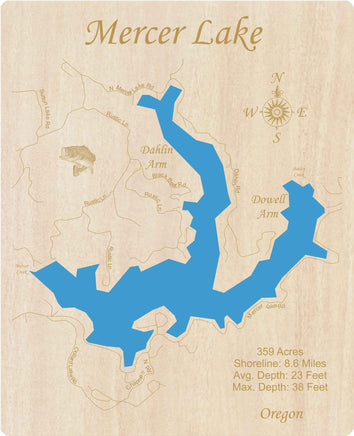 This is a beautiful, detailed, laser engraved and precision cut map, including lake information such as surface area, elevation and maximum depth.