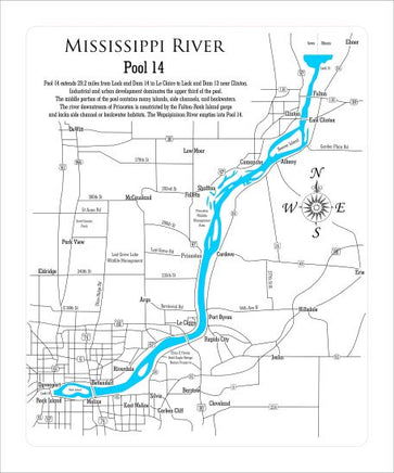 Pool 14 extends 29.2 miles from Lock and Dam 14 in Le Claire to Lock and Dam 13 near Clinton. Industrial and urban development dominates the upper third of the pool. The middle portion of the pool contains many islands, side channels, and backwaters. The river downstream of Princeton is constricted by the Fulton-Rock Island gorge and lacks side channel or backwater habitats. The Wapsipinicon River empties into Pool 14.