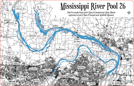 This is a beautiful, detailed, laser engraved and precision cut map of Pool 26 of the Mississippi River.