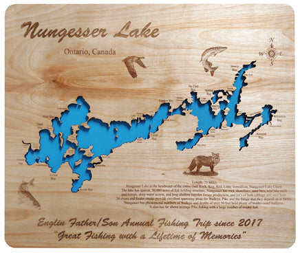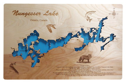 This is a beautiful, detailed, laser engraved and precision cut map, including lake information such as surface area, elevation and maximum depth.