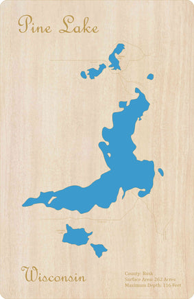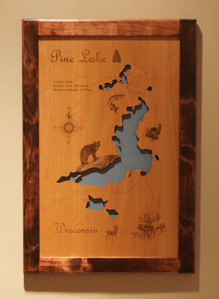 This is a beautiful, detailed, laser engraved and precision cut map, including lake information such as surface area, elevation and maximum depth.