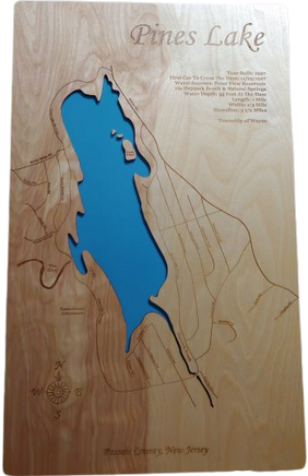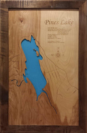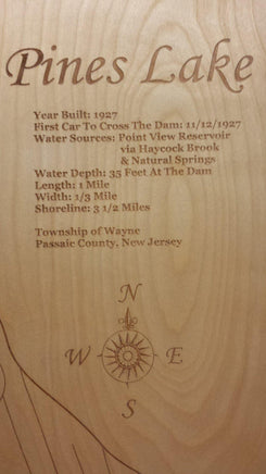 This is a beautiful, detailed, laser engraved and precision cut map, including lake information such as surface area, elevation and maximum depth.