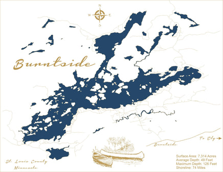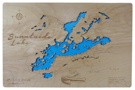 This is a beautiful, detailed, laser engraved and precision cut map, including lake information such as surface area, elevation and maximum depth.