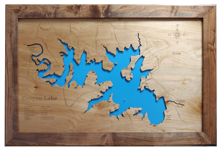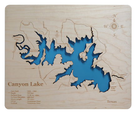 This is a beautiful, detailed, laser engraved and precision cut map, including lake information such as surface area, elevation and maximum depth.