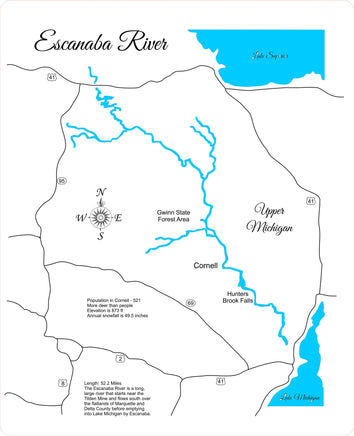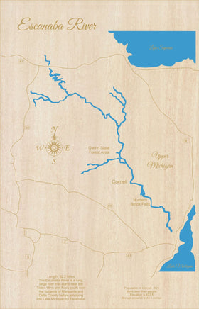 • The Escanaba River is a long, large river that starts near the Tilden Mine and flows south over the flatlands of Marquette and Delta County before emptying into Lake Michigan by Escanaba.