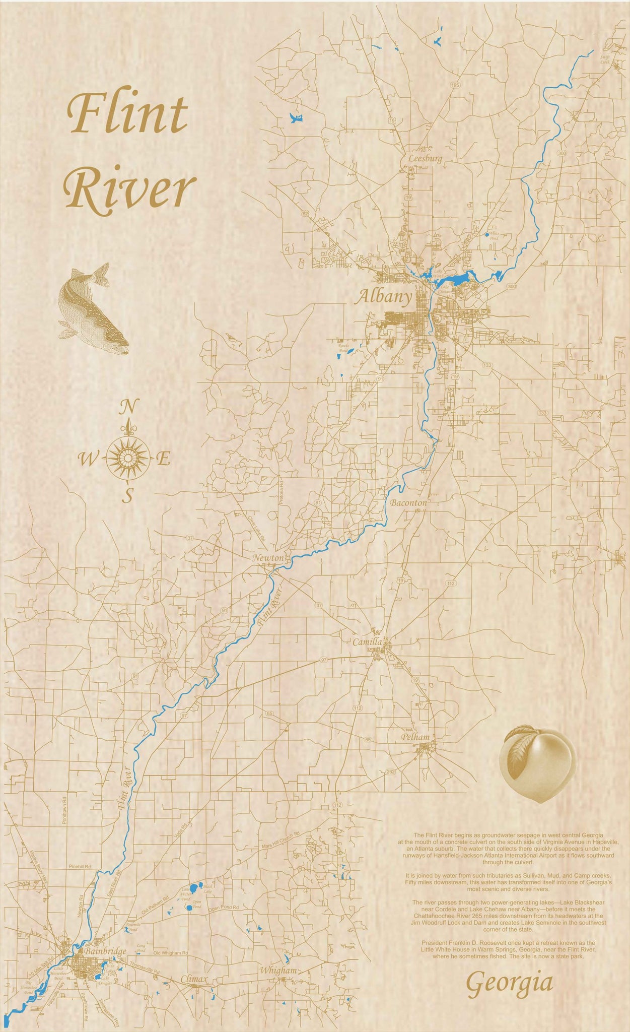 The river passes through two power-generating lakes—Lake Blackshear near Cordele and Lake Chehaw near Albany—before it meets the Chattahoochee River 265 miles downstream from its headwaters at the Jim Woodruff Lock and Dam and creates Lake Seminole in the southwest corner of the state.