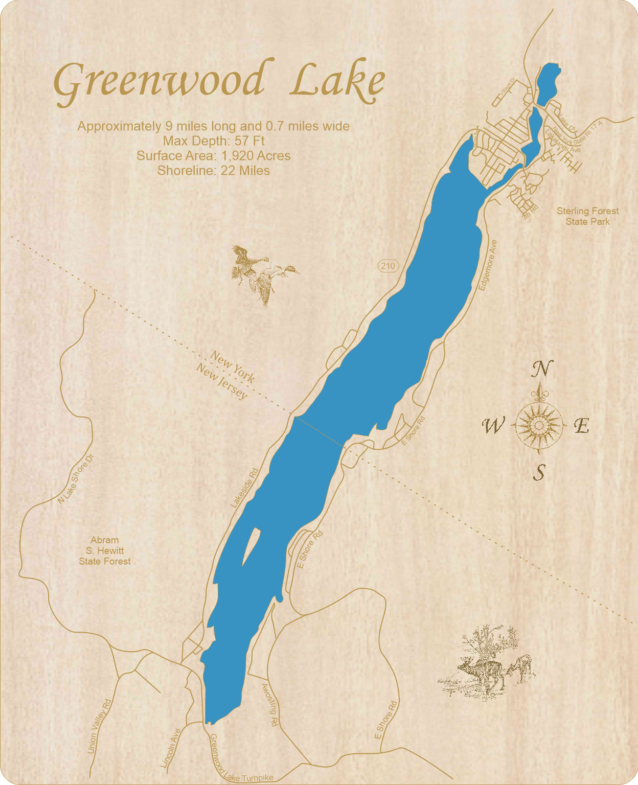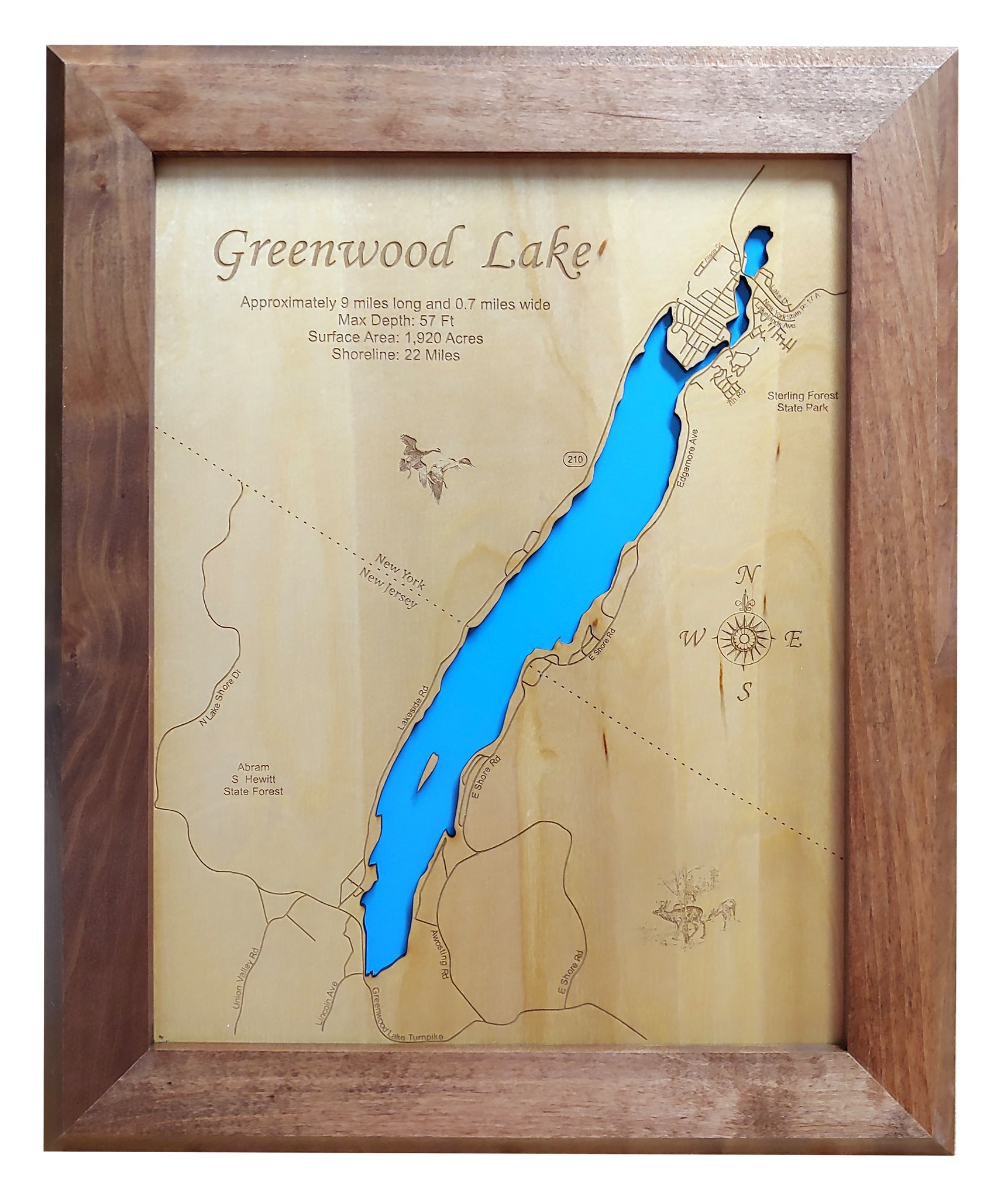 This is a beautiful, detailed, laser engraved and precision cut map, including lake information such as surface area, elevation and maximum depth.