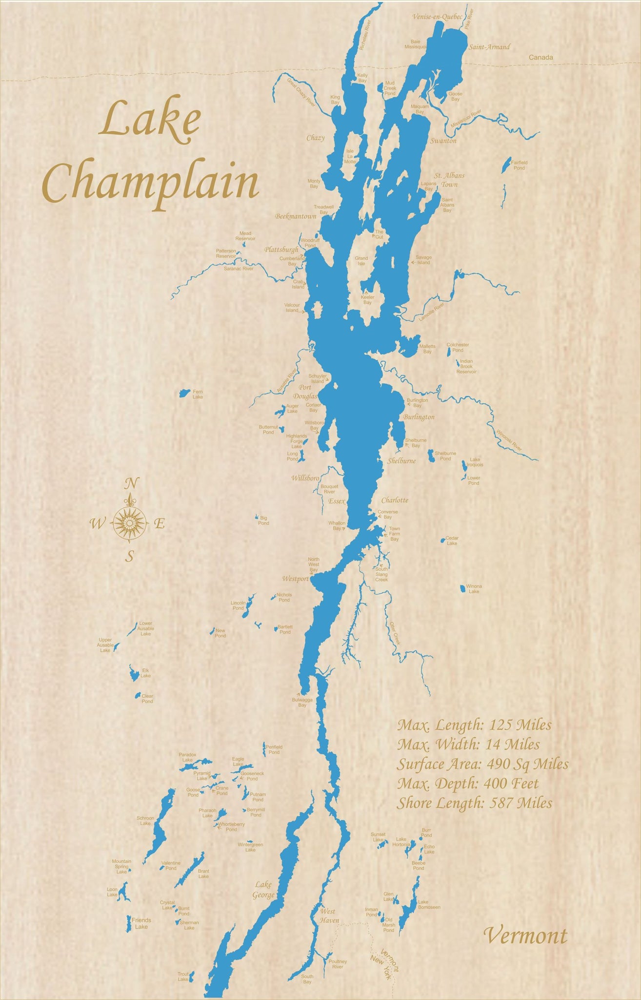 Lake Champlain, VT/NY, USA and Canada - Laser Cut Wood Map