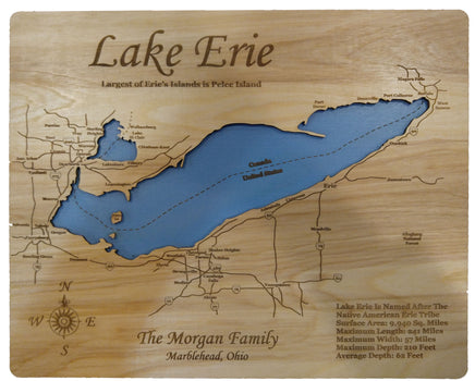This is a beautiful, detailed, laser engraved and precision cut map, including lake information such as surface area, elevation and maximum depth.