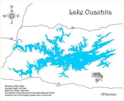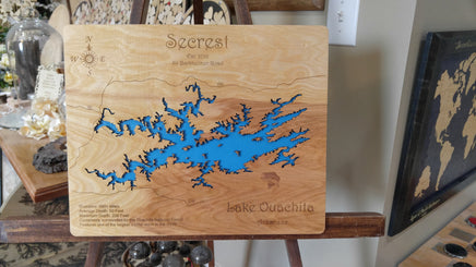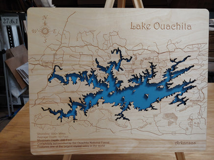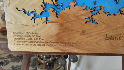 This is a beautiful, detailed, laser engraved and precision cut map, including lake information such as surface area, elevation and maximum depth.