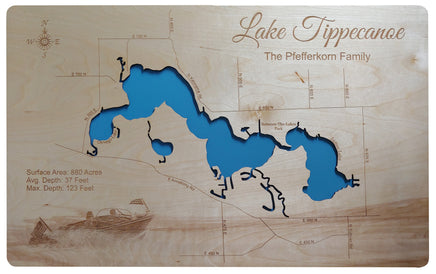 This is a beautiful, detailed, laser engraved and precision cut map, including lake information such as surface area, elevation and maximum depth.