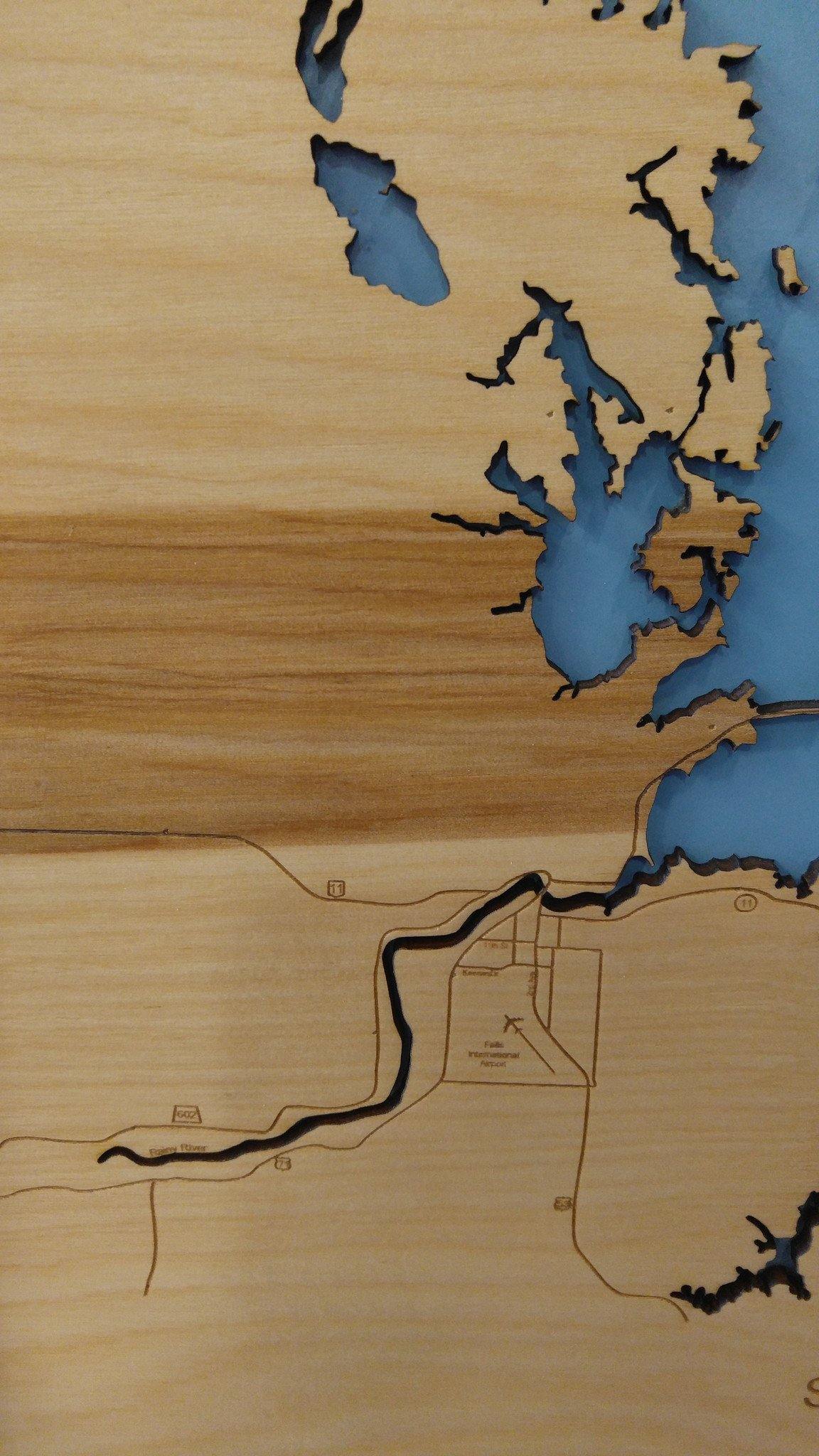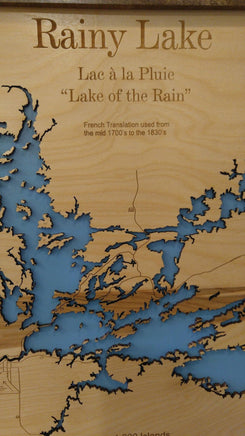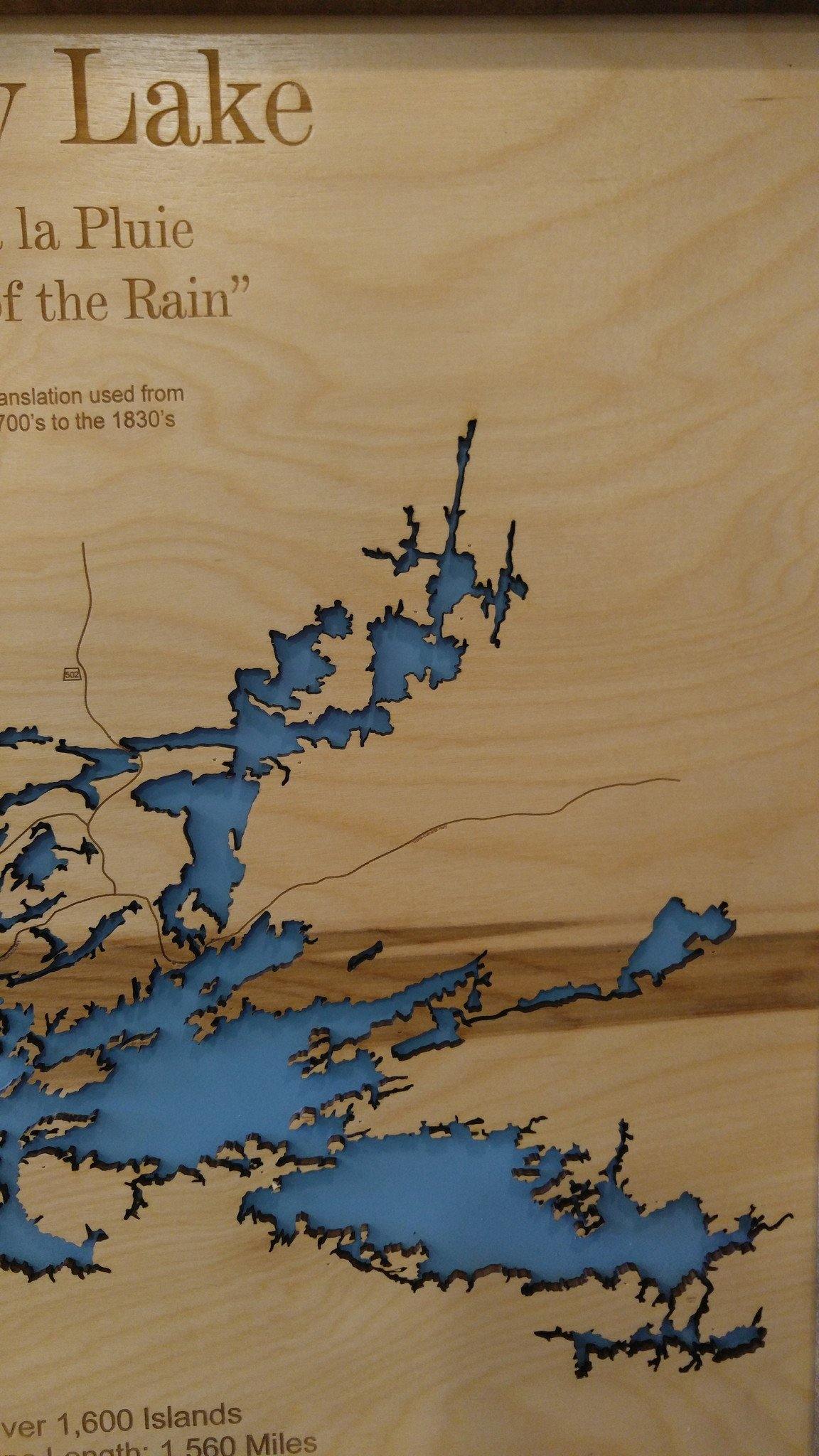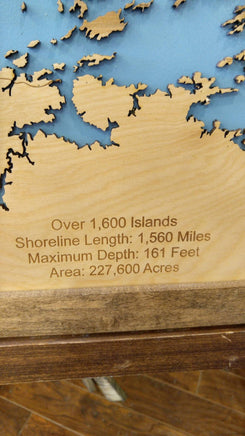 This is a beautiful, detailed, laser engraved and precision cut map, including lake information such as surface area, elevation and maximum depth.