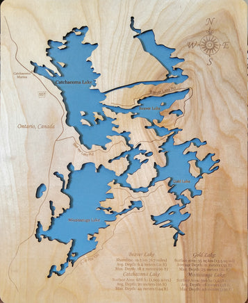 This is a beautiful, detail, laser engraved and precision cut map, including lake information such as surface area, elevation and maximum depth.