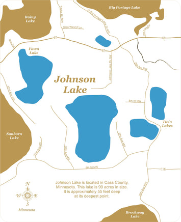 Johnson Lake is located in Cass County, Minnesota. This lake is 90 acres in size. It is approximately 55 feet deep at its deepest point.