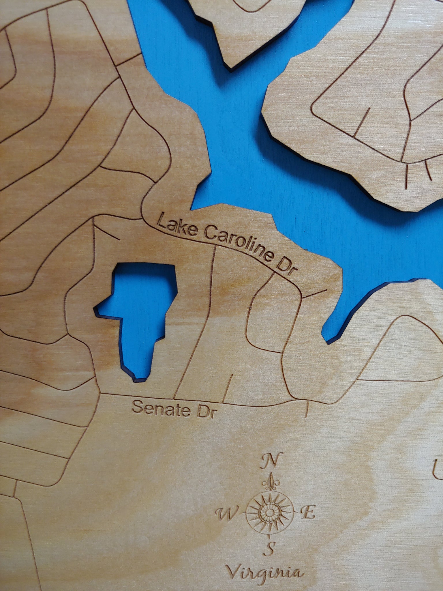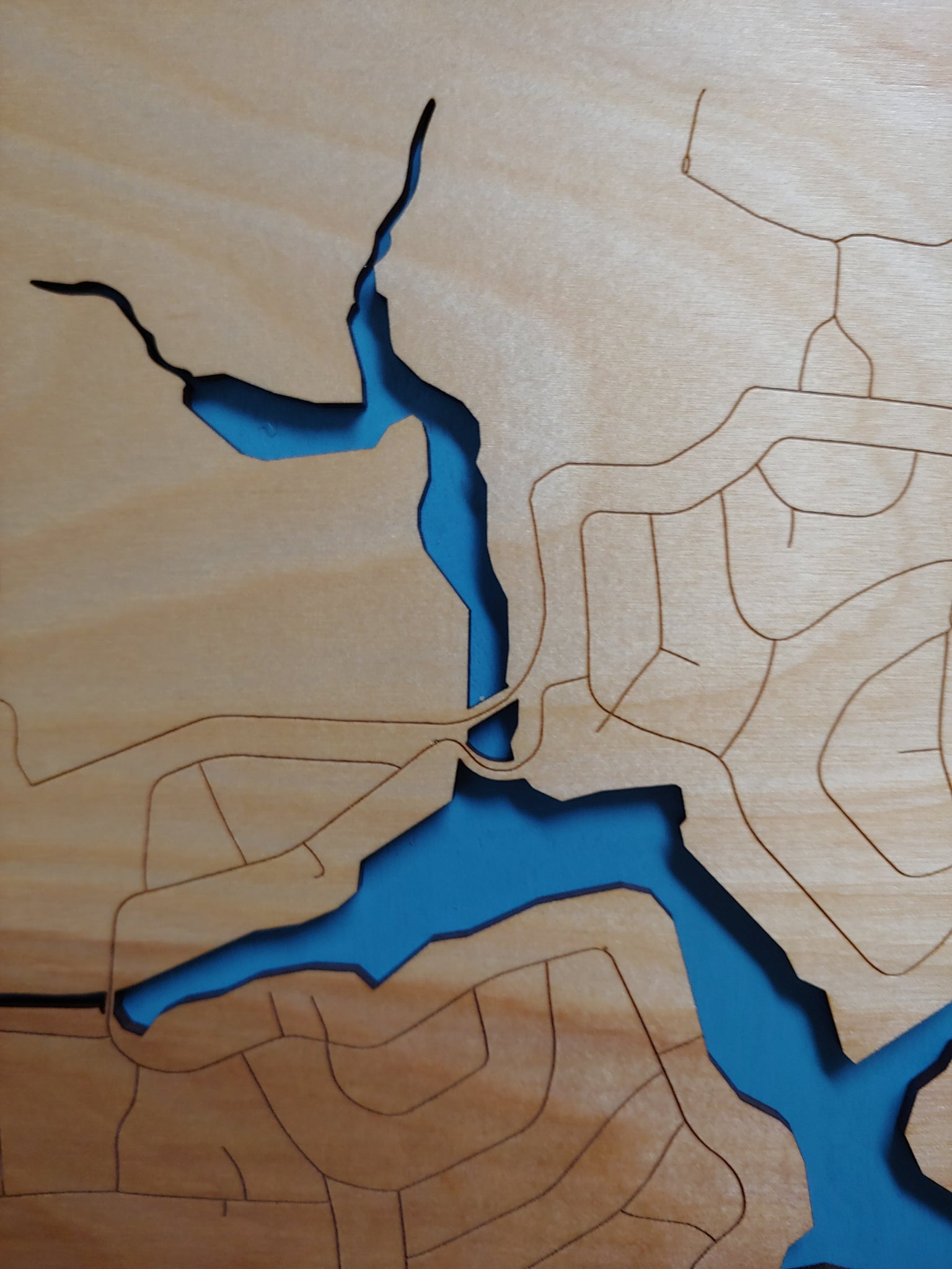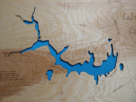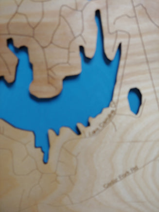 This is a beautiful, detailed, laser engraved and precision cut map, including lake information such as surface area, elevation and maximum depth.