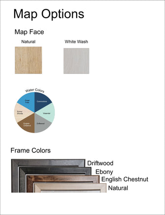 Our maps are made from beautiful birch plywood. Natural variances in the wood grain ensure a unique work of art. Once the map is cut, it is hand sanded multiple times, mounted on a blue board to highlight the water, and given a clear coat for a lustrous wood shine. Proudly made in the USA by American workers in an American owned business.