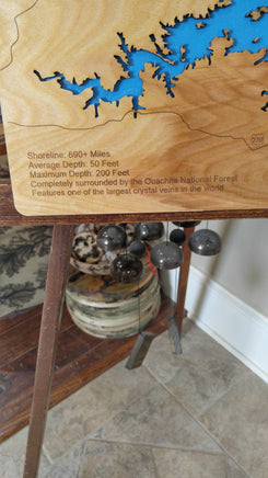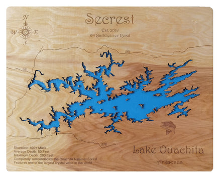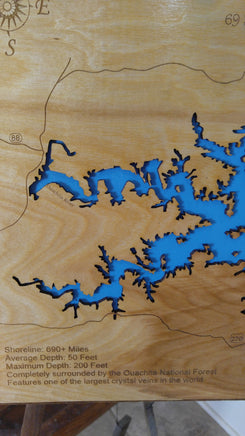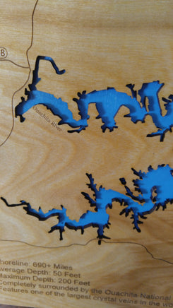 This is a beautiful, detailed, laser engraved and precision cut map, including lake information such as surface area, elevation and maximum depth.