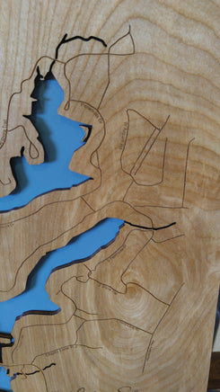 Our maps are made from beautiful birch plywood. Natural variances in the wood grain ensure a unique work of art. Once the map is cut, it is hand sanded multiple times, mounted on a blue board to highlight the water, and given a clear coat for a lustrous wood shine. Proudly made in the USA by American workers in an American owned business.