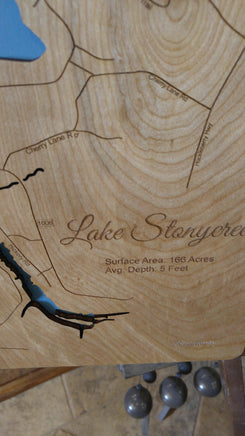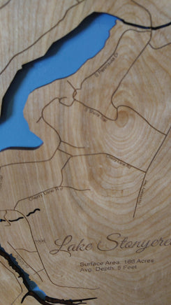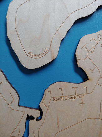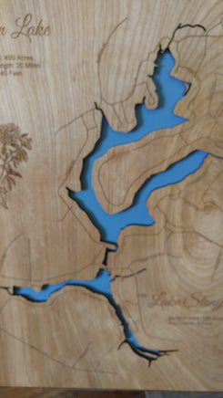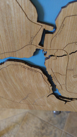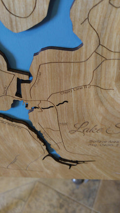 This is a beautiful, detailed, laser engraved and precision cut map, including lake information such as surface area, elevation and maximum depth.