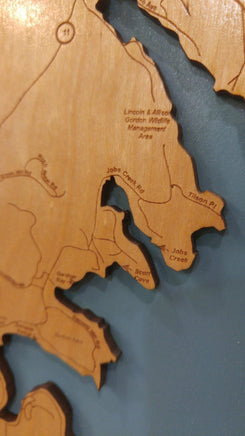 Our maps are made from beautiful birch plywood. Natural variances in the wood grain ensure a unique work of art. Once the map is cut, it is hand sanded multiple times, mounted on a blue board to highlight the water, and given a clear coat for a lustrous wood shine. Proudly made in the USA by American workers in an American owned business.