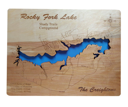 This is a beautiful, detailed, laser engraved and precision cut map, including lake information such as surface area, elevation and maximum depth.