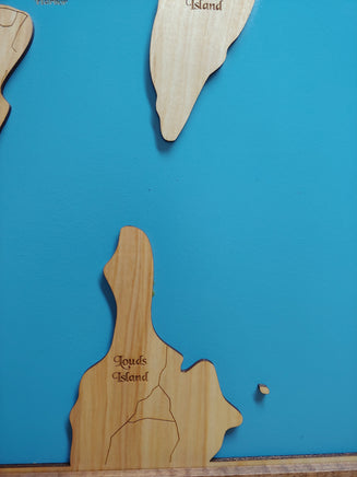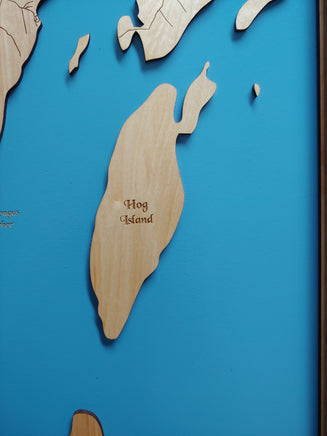 Our maps are made from beautiful birch plywood. Natural variances in the wood grain ensure a unique work of art. Once the map is cut, it is hand sanded multiple times, mounted on a blue board to highlight the water, and given a clear coat for a lustrous wood shine. Proudly made in the USA by American workers in an American owned business.