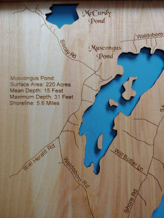 This is a beautiful, detailed, laser engraved and precision cut map, including lake information such as surface area, elevation and maximum depth.