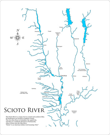 - The Scioto River is a major river in central and southern Ohio. Its headwaters are located in Auglaize County. The river then flows to Columbus, the capital city, and then in a southerly direction to Portsmouth, where it flows into the Ohio River. “Scioto” is an American Indian word meaning “deer”.