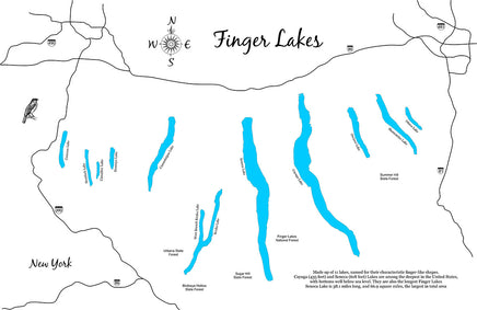 Made up of 11 lakes, named for their characteristic finger-like shapes. Cayuga (435 feet) and Seneca (618 Feet) Lakes are among the deepest in the United States, with bottoms well below sea level. They are also the longest Finger Lakes. Seneca Lake is 38.1 miles long and 66.9 square miles, the largest in total area.