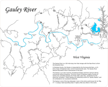 In Nicholas County, the Gauley is impounded by the Summersville Dam, a U.S. Army Corps of Engineers dam, to form Summersville Lake. The Gauley River National Recreation Area is downstream of the dam.