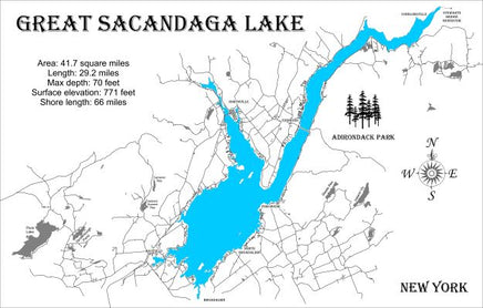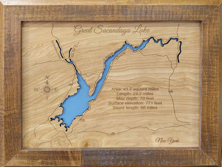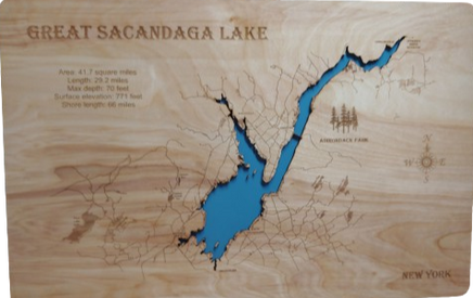 This is a beautiful, detailed, laser engraved and precision cut map, including lake information such as surface area, elevation and maximum depth.