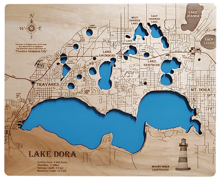 This is a beautiful, detailed, laser engraved and precision cut map, including lake information such as surface area, elevation and maximum depth.