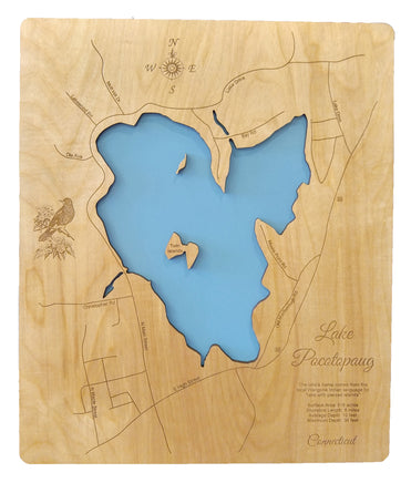 This is a beautiful, detailed, laser engraved and precision cut map, including lake information such as surface area, elevation and maximum depth.