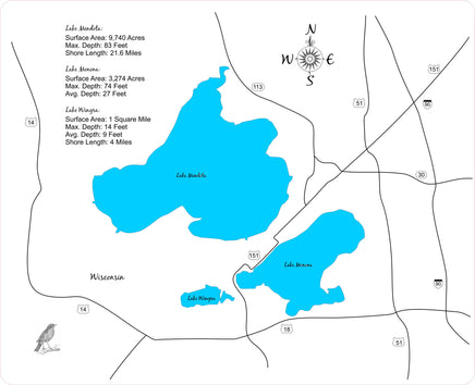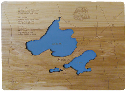 This is a beautiful, detailed, laser engraved and precision cut map, including lake information such as surface area, elevation and maximum depth.
