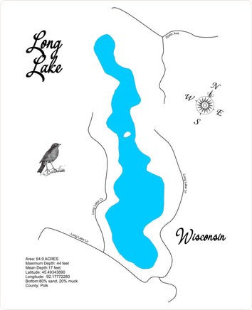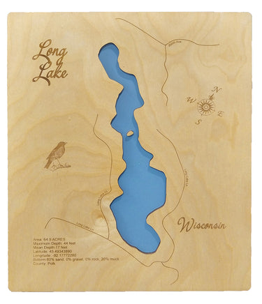 This is a beautiful, detailed, laser engraved and precision cut map, including lake information such as surface area, elevation and maximum depth.
