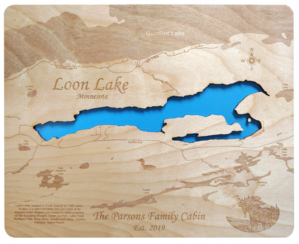 This is a beautiful, detailed, laser engraved and precision cut map, including lake information such as surface area, elevation and maximum depth.