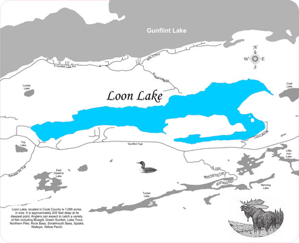 Loon Lake, located in Cook County is 1,095 acres in size. It is approximately 202 feet deep at its deepest point. Anglers can expect to catch a variety of fish including Bluegill, Green Sunfish, Lake Trout, Northern Pike, Rock Bass, Smallmouth Bass, Splake, Walleye, Yellow Perch.