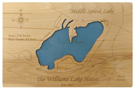 This is a beautiful, detailed, laser engraved and precision cut map, including lake information such as surface area, elevation and maximum depth.